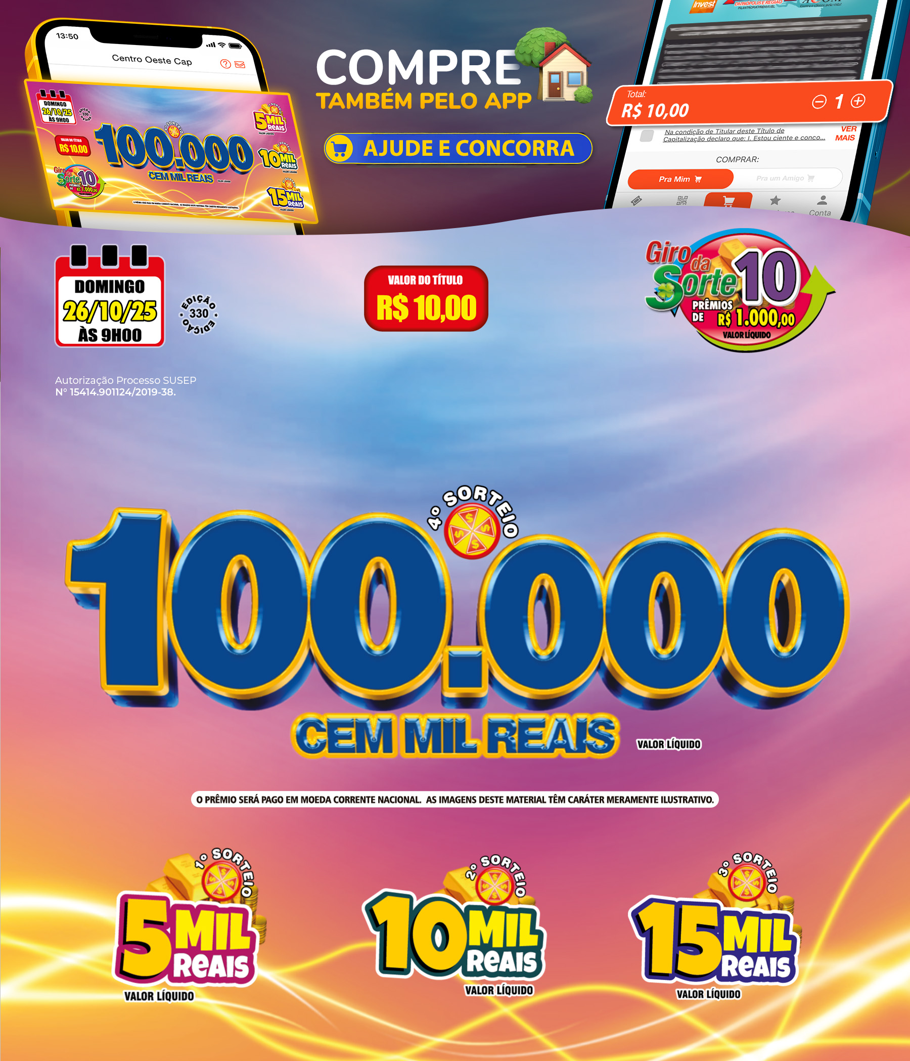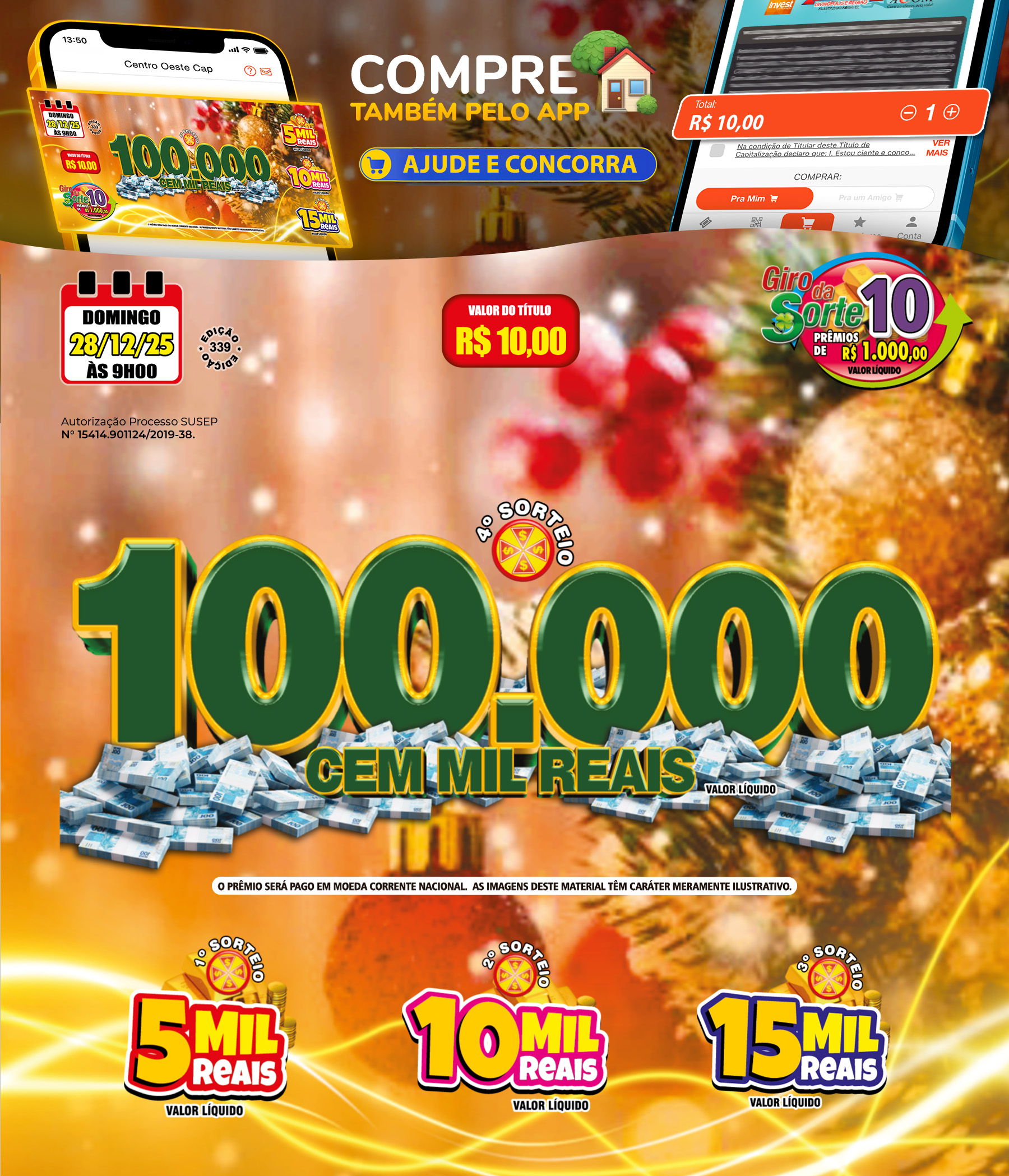 Compre seu título até as 23:59 do sábado sem sair de casa em apenas alguns passos 📲 Além disso, você pode acompanhar ganhadores, novidades e muito mais sobre o CENTRO OESTE CAP! Baixe já 🍀