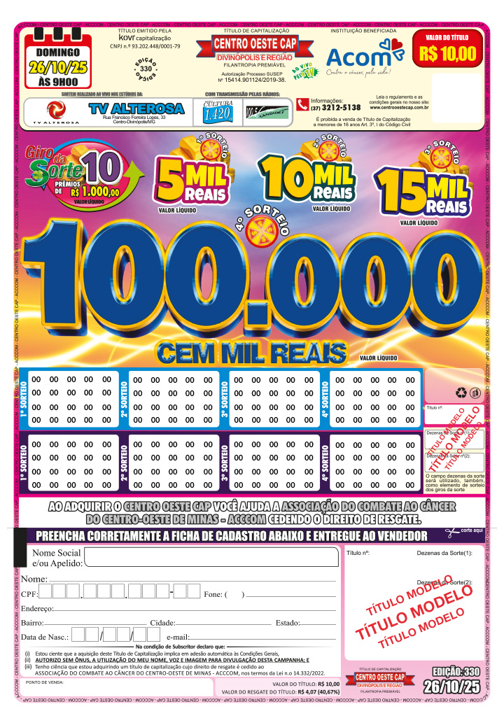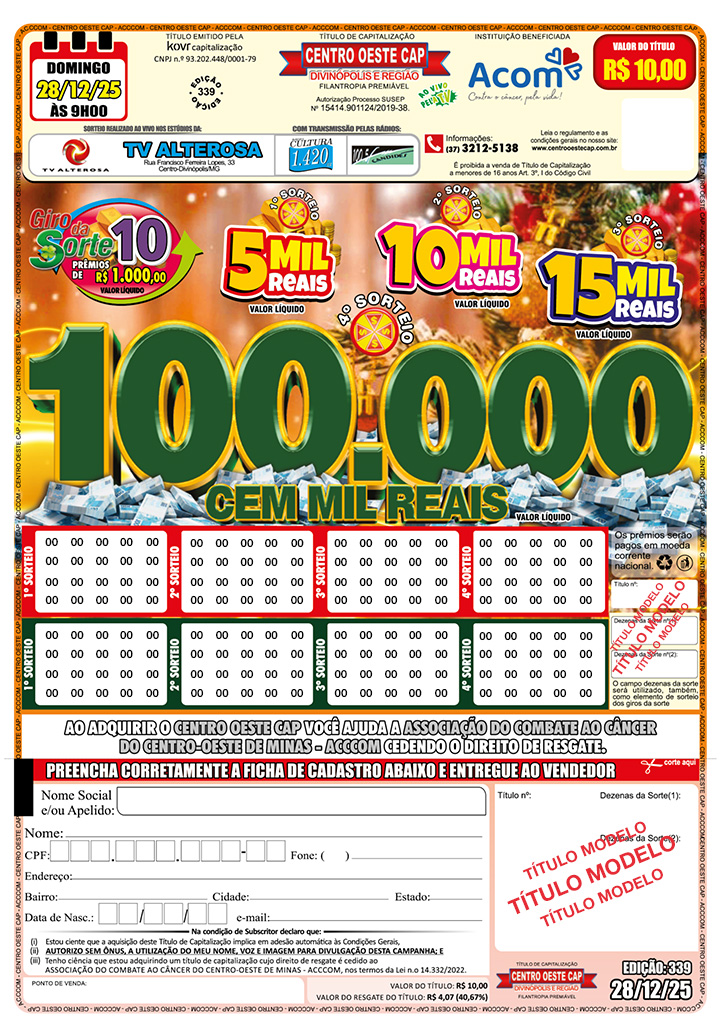 Os sorteios ocorrem ao vivo todos os Domingos, à partir das 09h00, com transmissão pela TV ALTEROSA. E também pelas rádios CULTURA 1420 AM, Rádio 87,9 FM, Rádio NOVA ONDA 91,5 e Rádio Candidés FM 100.5